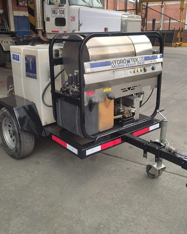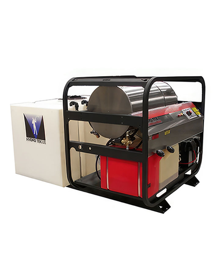 El Hydro Tek Tank Skid cuenta con un tanque de agua de 185 o 270 galones, completamente conectado para uso inmediato, filtración de agua incorporada, un marco de acero resistente, protegido por un acabado duradero de pintura en polvo texturizada aplicada electrostáticamente, montado con su selección de máquina.